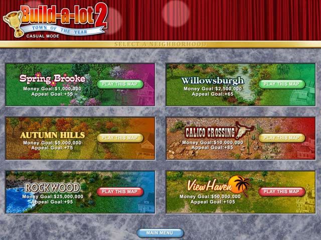 It's time to get busy again building, buying and selling houses in this exciting sequel! There are new towns to explore, new Mayors to meet and lots of money to be made! Use your keen eye to pick the right locations to build parks and shops. Pick your paint colors, upgrades and landscaping to create the ultimate curb appeal and earn outstanding profits. How about a latte from the new coffee shop? Some new flower boxes from the garden center? It's all waiting for you in Build-a-lot 2!